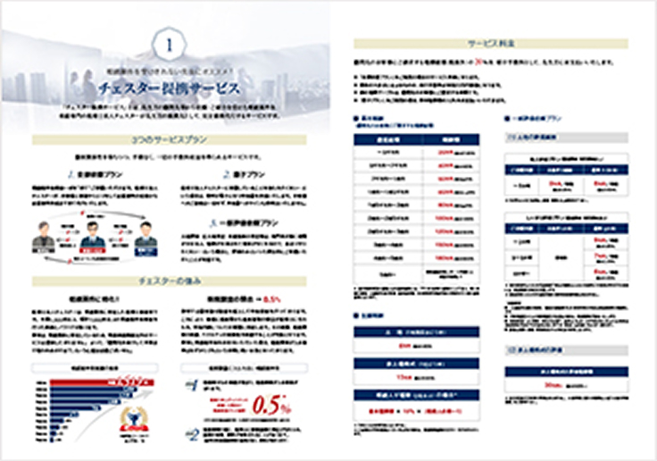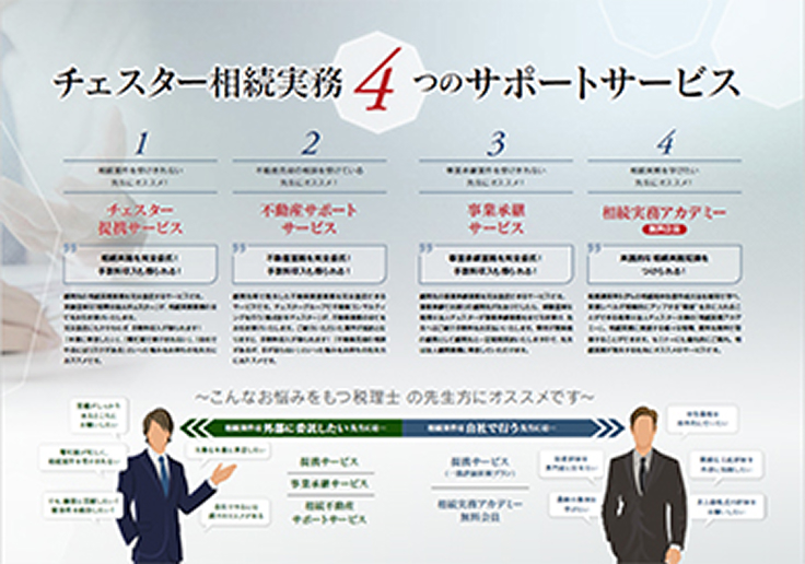 相続税申告、土地評価等の相続税関連業務をチェスターに完全委託(丸投げ)するサービスです。チェスターで顧客対応から申告書の作成、提出までの相続税申告業務等を全て引き受け、ご依頼頂いた先生には報酬に比例して紹介手数料をお支払いさせて頂きます。